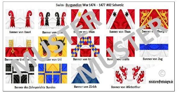 Banner von Basel,Banner von Thun, Banner von Thurgau,Banner von Unterwalden, Banner von Uri,Banner von Vaud, Banner von Wallis, Banner von Zug, Banner des Zehngerichte Bundes, Banner von Zürich, Banner von Winterthur