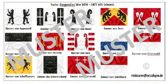 Banner von Appenzell, Banner von Basel, Banner von Bern, Banner von Biel,Banner von Friebourg, Banner von Geneve, Banner von Jura, Banner von Luzern, Banner von Oberwald, Banner von Schaffhausen, Banner des Oberen Bund, Banner von Solothurn