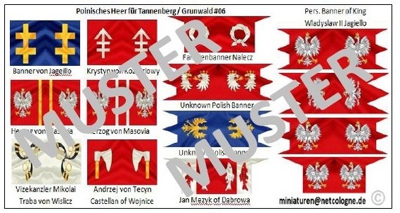Banner von Jageillo, Krystynvon Kozieglowy, Herzog von Masovia, Vizekanzler MikolaiTrabavon Wislicz, Andrzej von TecynCastellanofWojnice, Jan MezykofDabrowa, Familienbanner Nalecz, Persönliche Banner ofKing Wladyslaw II Jagiello