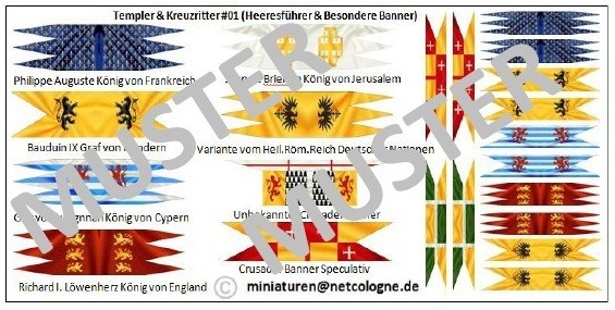 Philippe Auguste König von Frankreich, Jean de Brienne König von Jerusalem, BauduinIX Graf von Flandern, Variante vom Banner des Heiligen Römischen Reichs Deutscher Nation, Guy von Lusignnan König von Zypern, Richard I. Löwenherz König von England & Spekulatives Banner