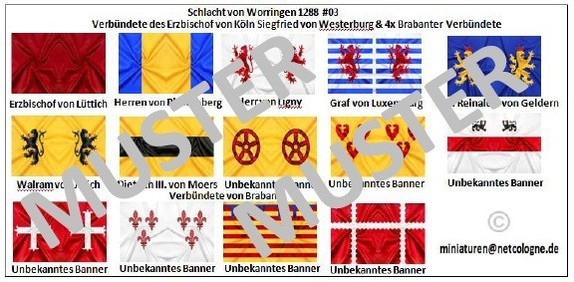 Verbündete des Erzbischofs: Erzbischof von Lüttich, Herren von Plettenberg, Herr von Ligny, Graf von Luxemburg, Graf Reinald I. von Geldern, Walram von Jülich, Dietrich III. von Moers, & 4 weitere Unbekannte Banner der Brabanter