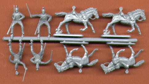 Eines der wenigen österreichischen Kavallerie-Sets für die napoleonische Epoche. Die Helme dieser Art wie sie dise Figuren tragen waren von ca. 1800-1805 üblich, danach war die Raupe auf dem Helm höher. Diese Figuren sind also relativ eingeschränkt nutzbar und man hätte sich Ersatzköpfe wie in anderen Sets von HäT gewünscht um sie auch für spätere Feldzüge umbauen zu können. Anderenfalls braucht man schon einiges Geschick, um die Helme umzubauen. Die Haltungen der Figuren sind ganz gut getroffen, ebenso die Uniformen (richtig: keine Rückenplatte beim Brustharnisch!). Der Guss, auch bei den Pferden, ist eher mittelmäßig, da muss man einiges nacharbeiten, wenn es realistisch wirken soll. Insgesamt daher nur mittelmäßige Sterne, vor allem weil diese Figuren nur für so wenige Feldzüge passen.