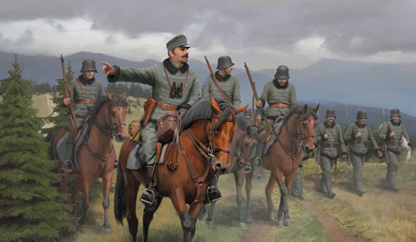 finde ich allerdings mehr als irreführend! Die Honved war im ungarischen Teil der k.u.k. Monarchie das Gegenstück zur Landwehr in Österreich, also eher Truppen 2. Ranges, die jedoch während des 1. Weltkriegs sehr wichtig waren. Die Figuren hier haben die Paradeuniform der Honved zum Vorbild, die jedoch nicht so im Feld getragen wurde. Ich finde die Figuren aber trotzdem wirklich gut, weil man diese Uniformen leicht zu allgemeinen Winteruniformen, z.B. für die Alpenfront machen kann, denn Pelzkragen passen super zur Winterausrüstung. Wenn man das beachtet hat man tolle Figuren fürs Gebirge oder auch für den Winter im Allgemeinen. Aufgrund der getragenen Stahlhelme passen die Figuren in die Jahre ab 1916, eher 17-18. Damals waren auf Grund des allgemeinen Mangels, einheitliche Winteruniformen eher die Ausnahme geworden und solche Bekleidung wie hier eher realistisch. Daher rate ich unbedingt dazu diese Figuren in die Sammlung aufzunehmen. Schön ist auch, dass es mal ein Paar österreichische Reiter gibt, die man für den 1. Weltkrieg sonst gar nicht bekommt.