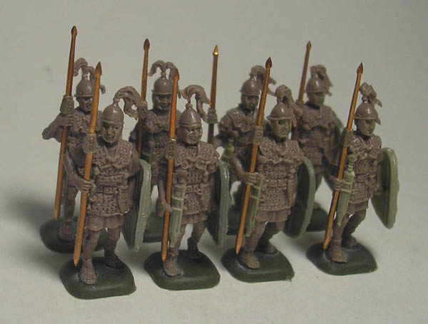 stimmig in ihrer Ausrüstung und in ihren Posen modelliert. Die auf den Fotos zu dick erscheinenden Schilde sind im Figurensatz aber nicht enthalten sondern dünne und somit brauchbare Ausführungen. Es fehlt zwar wie bei der Imperialen Legion auf den Marsch das Führungspersonal wie Legaten, Zenturion Optio, Thesarus, Signifer, Aquilifer und Cornicen. Die kann man aber durch kleine Umbauten oder durch andere Figurensätze ergänzen. Warum es zeremonieller Marsch heißt ist mir unverständlich. Entweder marschierten Roms Legionäre in diesem Ausrüstungszustand in der nähe des Feindes bzw. im Feindesland oder durch die Städte der römischen Provinzen. Aber auch als Begleitung von Transporten, Patroullie, Aber auch als eine ins Gefecht marschierende zweite Schlachtlinie. Für einen Triumphmarsch in ROM sind sie leider nicht zu verwenden, Da es der Legion verwehrt war ROM bewaffnet zu betreten. Dies war ein Privileg der römischen Stadtgarde der Prätorianer. Selbst bei den seltenen Triumphzügen die vom Senat nur einem verdienten, beim Volk beliebten und äußerst siegreichen Feldherrn genehmigt wurden. Wurden die Legionäre stark "entmilitarisiert" und trugen nur ihre Tunika und mit Blumenumwickelte Speerschäfte, Zwar wurden diese Auflagen in späterer Zeit gelockert aber Triumphzüge blieben eine Seltenheit,