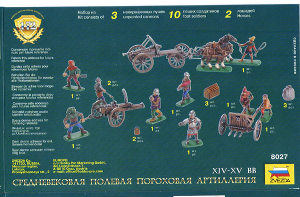Dargestellt sind 3 verschiedene Geschütze mittelalterlicher Schwarzpulver Artillerie inklusive Protzen, Zugpferde und Bedienung zur Zeit des 14-15. Jahrhunderts, im Maßstab 1:72.