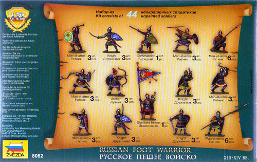 Dargestellt sind russische Krieger inklusive Kommandoeinheit des 13.-14 Jahrhunderts. Es wird somit ein Teil der Zeit der Mongolenherrschaft und Kampf um die Herrschaft der Rus abgebildet. Es sind Speerträger, Schwertkämpfer und Plänkler enthalten, sowie Anführer und Standartenträger.