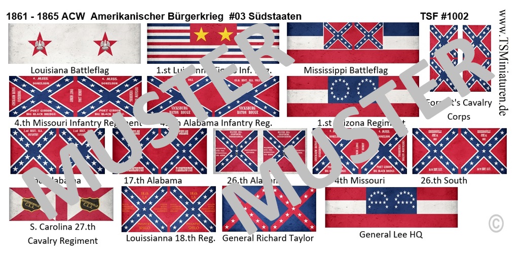 - 16 Fahnen aus Papier zum Ausschneiden im Maßstab 1:72 für die Konföderierte Armee im Amerikanischen Bürgerkrieg