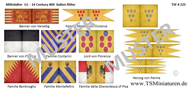 13 verschiedene Fahnen für Italienische Städte (Venedig, Ferrara, Parma, Florenz), Adlige (Medici, Contarini, Bentivoglio, Montefeltro, Gherardesca v. Pisa), Sizilien und Kalabrien im Maßstab 1:72