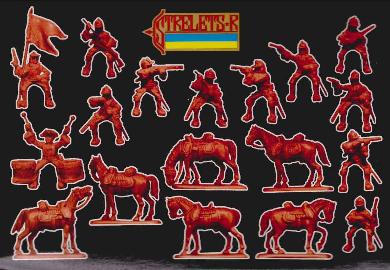 - Contents: 12 figures, 12 horses, plastic, unpainted, including command group, scale 1:72, which corresponds to a size of 20-25mm